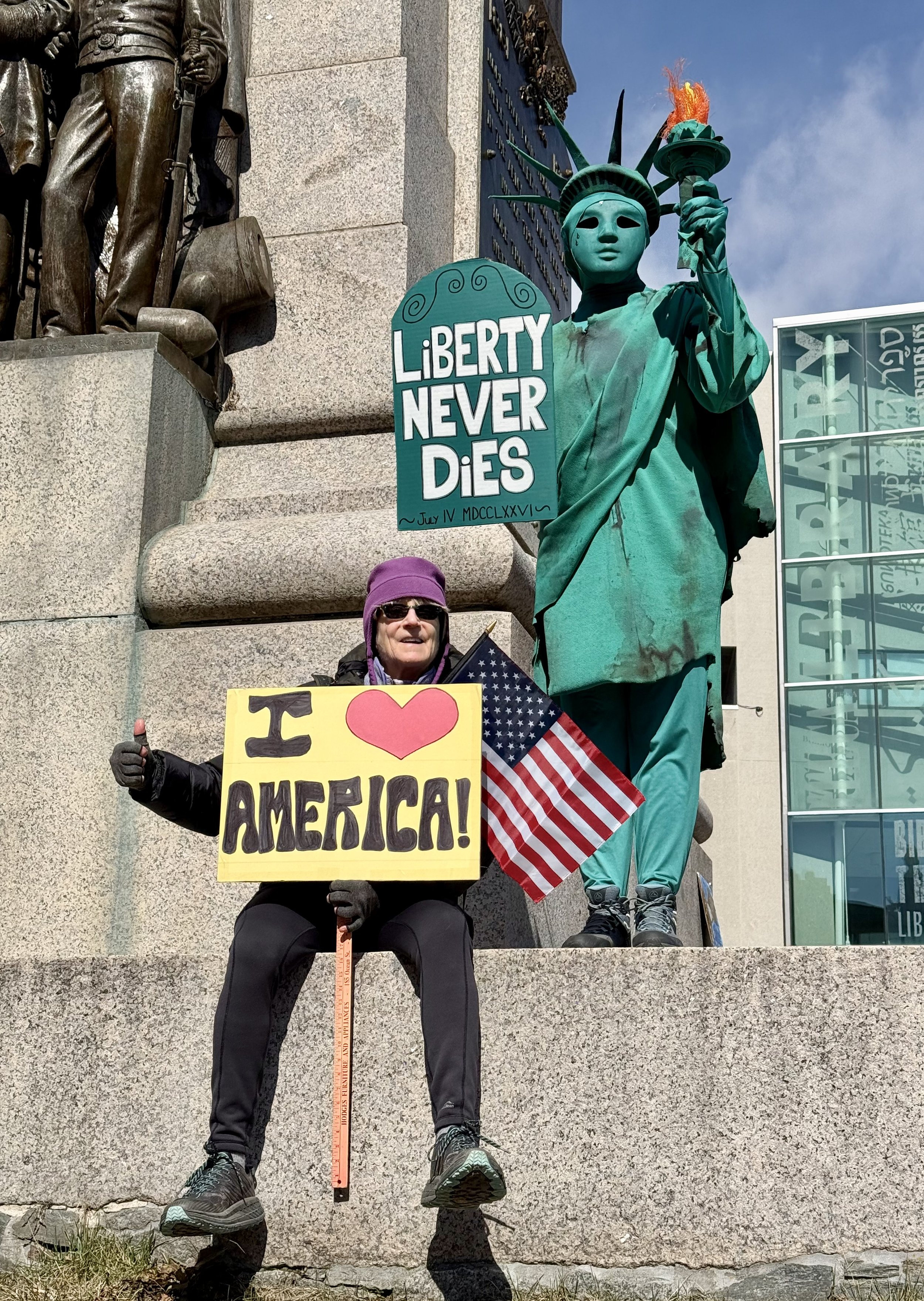 Mark's trio put on a fabulous show & I got to hang with Mark for a bit after the concert. 2 days after that, I was back in Portland to take part in the No Kings Rally in Monument Square. I arrived early, thinking that parking in town would be easier then vs. close to event kick off time. I befriended some folks near the monument prior to the arrival of throngs of people & they snapped this photo of me with Lady Liberty: