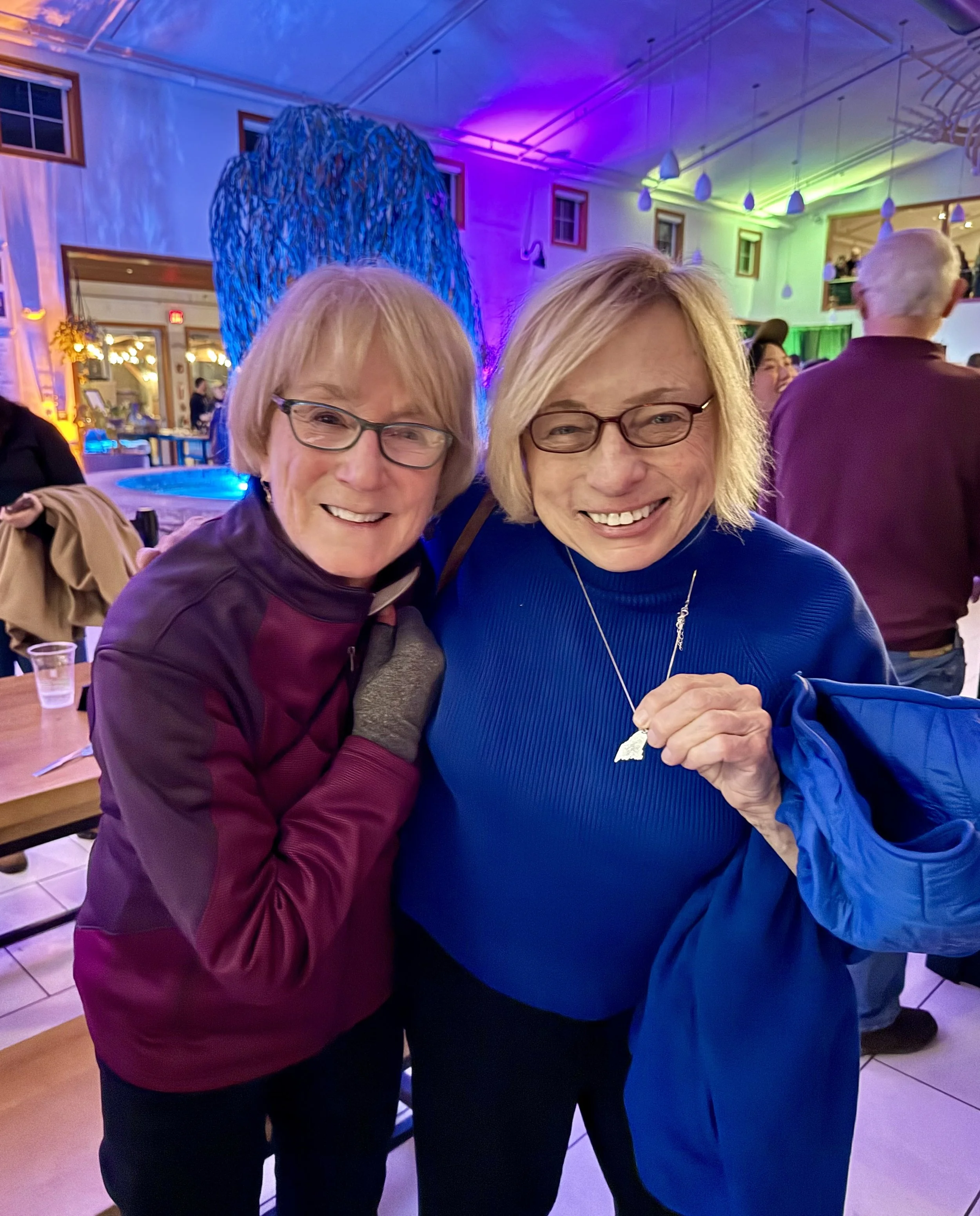 In spite of a gray, damp & very chilly day on March 20th, I went to Freeport to hear The Mallett Brothers Band to celebrate the 1st official day of spring. Their concert at The Maine Beer Company sold out, the place was packed & per usual, the sons of the late great Dave Mallett & their band mates totally rocked the venue. Always a big fan & friend of Dave Mallett's, our governor Janet Mills came to the show that night to support the Mallett Brothers as well. I had an opportunity to chat with her toward the end of the night & noticed she was wearing the gold state of Maine necklace that was created by my cousin Elizabeth Prior, a well-known jeweler from the Portland area. Governor Mills was surprised to learn that "Liz is my cousin, her Dad was my Mom's brother & my middle name is Prior." She graciously allowed her friend to snap our picture so I could send it to Liz. She said she wears that necklace every day & my cousin Liz got a kick out of this photo, of course: