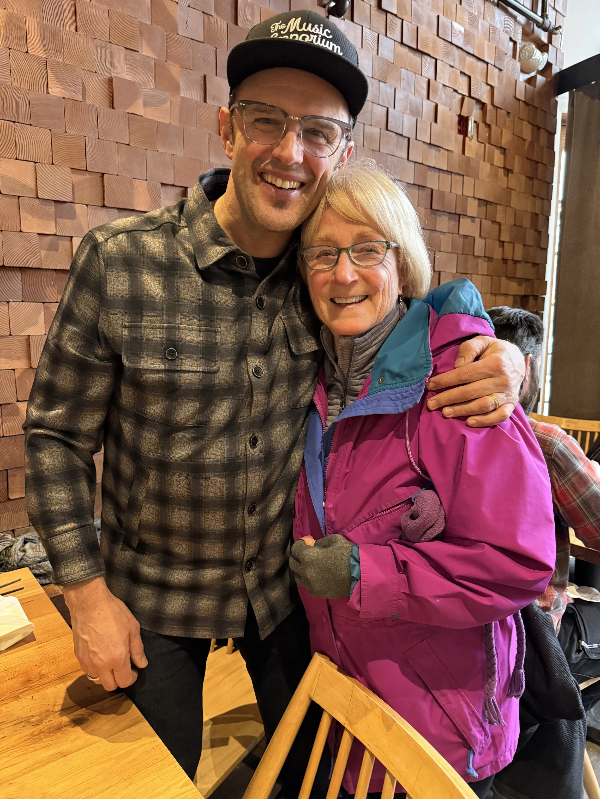 In addition to shows in Westbrook & Freeport, I soaked up the soulfulness of 2 concerts at One Longfellow Square in Portland. My pal Amy & I caught the amazing Alisa Amador there on March 6th. 3 songs into the show I whispered to Amy that "she sings like Alysa Liu skates". Truth... that gal sings with such freedom & joy it had my eyes welling with tears more than once. Check out her 2022 Tiny Desk concert online... you can thank me later. Then, on March 26th I caught a double bill at OLS with Robbie Fulks & the Mark Erelli Trio. I had never heard Robbie... his lyrics, his voice & his fun demeanor drew me in, but his guitar playing bowled me over. Man oh man... that dude can play! I've known Mark Erelli for a very long time, but I've not crossed paths with him for decades. Back in the late 90s, Mark hired me to perform several different concerts at Bates College, where he was studying biology & writing songs & playing guitar on the side. He continued his education in Biology, earned his masters, then made the choice to put his Biology career on hold to try his hand at playing music full time to see where it would take him. Many years & 14 albums later, his name is near the top of the list of successful touring singer-songwriters. He has written with, recorded with & performed with some of the best & I finally caught up with him. Get this... I was watching for doors to open at OLS from a window seat in an eatery across the street when I saw Mark & his trio mates walk through those doors & enter the restaurant next to the one I was in. I paid my tab & went next door & found him. He knew me right away, big hugs ensued & his pal snapped this picture: